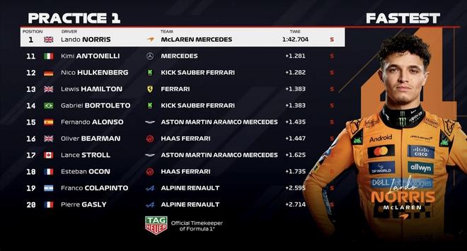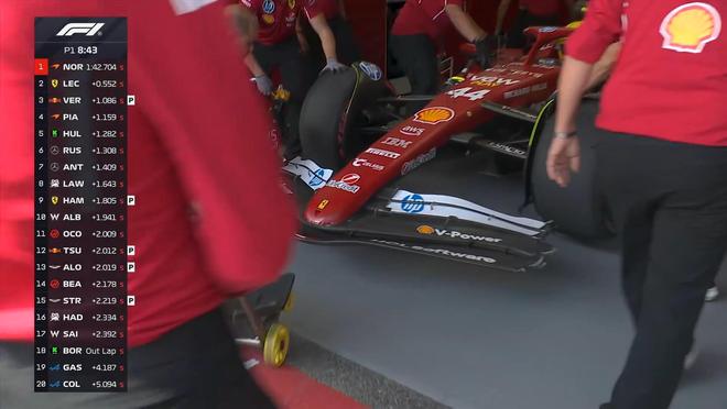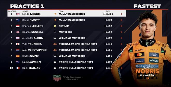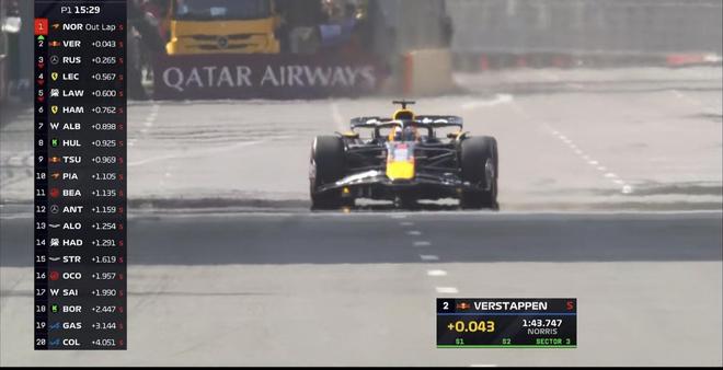 一练进行至45分钟,大家都做出有效成绩,诺里斯领跑,维斯塔潘紧随其后;