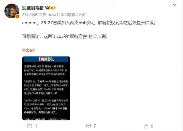直播吧9月23日讯 今天,媒体人@别跑刚背猪 在社媒上谈到了cba恢复升降级相关的流言。@别跑刚背猪 在个人微博上写道:“emmm,26-27赛季加入两支NBL球队,联赛授权到期之后恢复升降级。“可想而知,这两年cba的‘军备竞赛’将会加剧。”