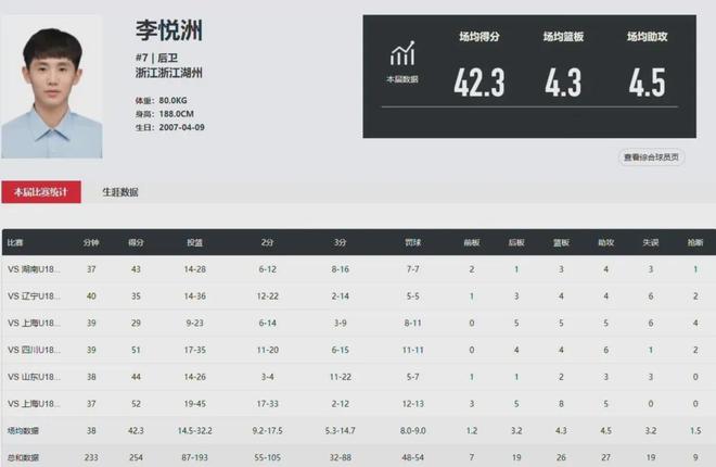 6场比赛,李悦洲场均轰下了42.3分4.5助攻,每场比赛顶着双人甚至三人包夹,投出了场均35.6%的三分球命中率。淘汰赛阶段的比赛是背靠背靠背,连打三场,李悦洲先是在四川U18男篮身上拿下51分4篮板6助攻,半决赛对阵山东U18男篮又轰44分,最后面对上海U18男篮的上半场就独得接近40分,全场拿下52分。