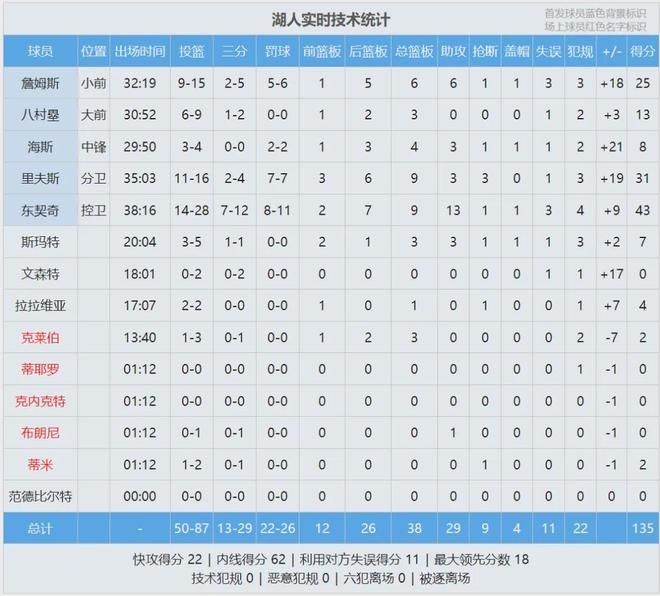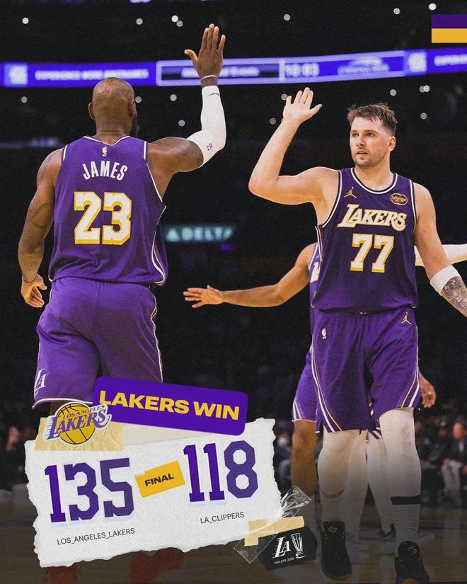 艾顿今天休战,祖巴茨面对海斯,居然占不到便宜。第二节湖人32-28单节净胜4分,半场战罢,湖人69-66领先快船。东契奇半场32+3+6,哈登16+4+5。易边再战,湖人依然压制快船。湖人防守端死掐哈登这一点,小卡隐身了。三节打完,湖人98-93领先5分,东契奇前三节已经轰下37+8+8。原本以为双方能打到最后一刻,结果湖人一波14比4领先到两位数。末节最后3分半,湖人仍然领先10分。邓恩抢篮板推倒东契奇,海斯替队友出头,双方爆发冲突。邓恩被直接驱逐,海斯吃了个技术犯规。比赛已经没悬念了,全场结束,湖人135-118大胜快船。湖人双喜临门:重返西部第二;小组出线,锁定NBA杯的淘汰赛资格。东契奇43分9板13助、里夫斯31分9板3助、詹姆斯25分6板6助。