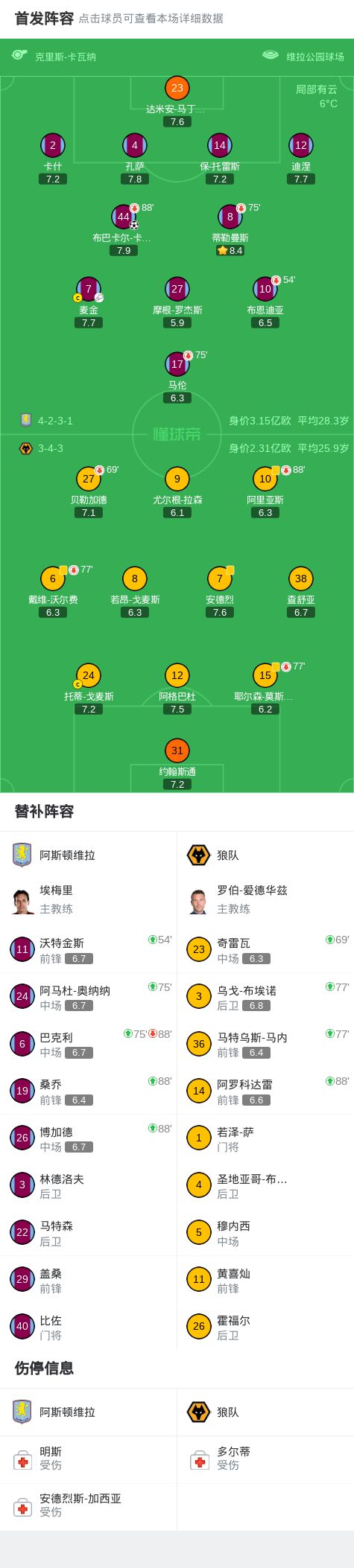 北京时间11月30日,英超联赛第13轮,阿斯顿维拉坐镇主场迎战狼队。比赛中,尤尔根-拉森进球被吹。麦金送出助攻,布巴卡尔-卡马拉世界波破门打进全场唯一进球,大马丁屡献神扑力保城池。最终,阿斯顿维拉主场1-0战胜狼队。