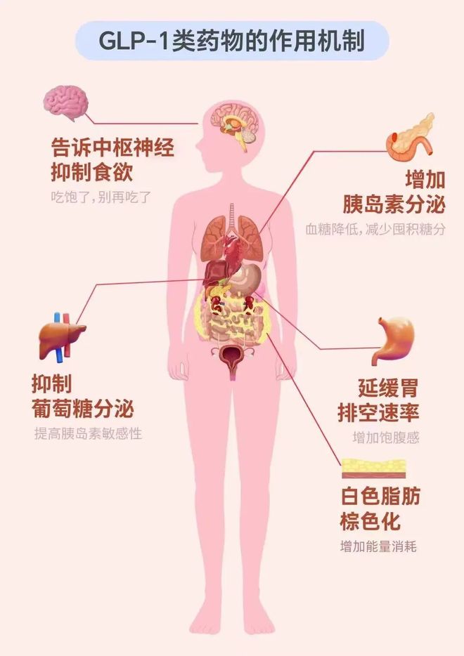 但其实并不是——我们吃完饭后,人体小肠会分泌一种叫GLP-1的物质(人体自带)。它就像身体里的“饱腹信使”,负责向大脑报告:“别吃了!”