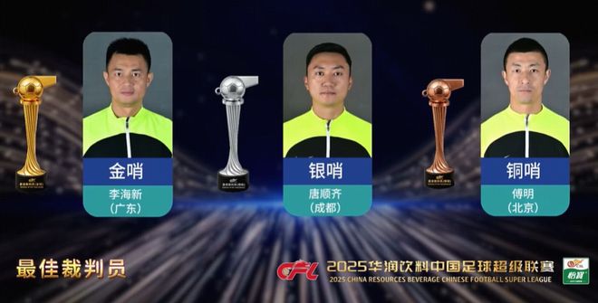 - 中超 | 官方:李海新当选2025赛季中超金哨,唐顺齐当选银哨,傅明当选铜哨