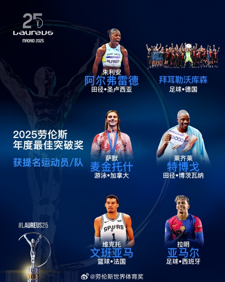 3月3日讯 官方消息,2025劳伦斯世界体育奖“年度最佳突破奖”提名,勒沃库森、亚马尔、文班亚马入围,去年这一奖